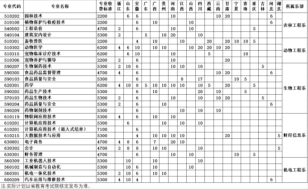 2019年学院三年制专科在全国招生计划