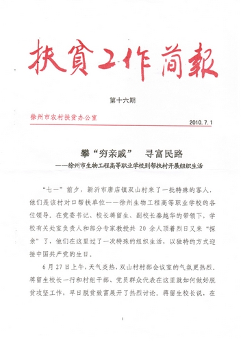2010年7月1日市《扶贫工作简报》专题介绍了我院到新沂市唐店镇双山村进行帮扶的活动。