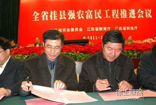 “挂县强农富民工程”是省委省政府2009年部署的科技富民重大活动之一。活动开展以来,学校积极响应省委省政府号召,成立了专门的领导工作小组和专家服务团队。2010年,专家服务团队在对接县丰县宋楼镇、孙楼镇、大沙河镇所辖5个村进行驻村科技服务,充分发挥学校在林果、畜牧、兽医、植物保护、农业经济管理、食品加工等方面的学科和科研优势,开展了推广新技术、新品种、新模式,帮助农民推介农产品市场、搭建农业信息平台、帮办农业合作社、引进新的农业或农产品加工项目、建立长效农业技术培训推广体系等多项工作,受到了老百姓和当地政府的一致好评。2010年,在驻村专家的帮扶下,5个村年示范户户均纯收益达4.93万元,环比增1.08万元,收益增长28.08%。