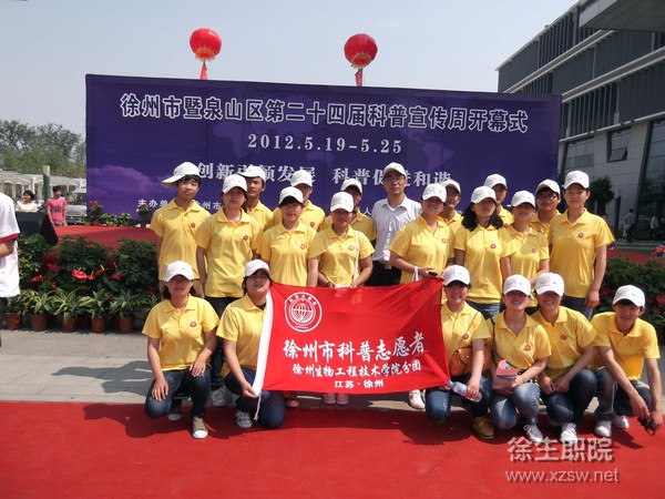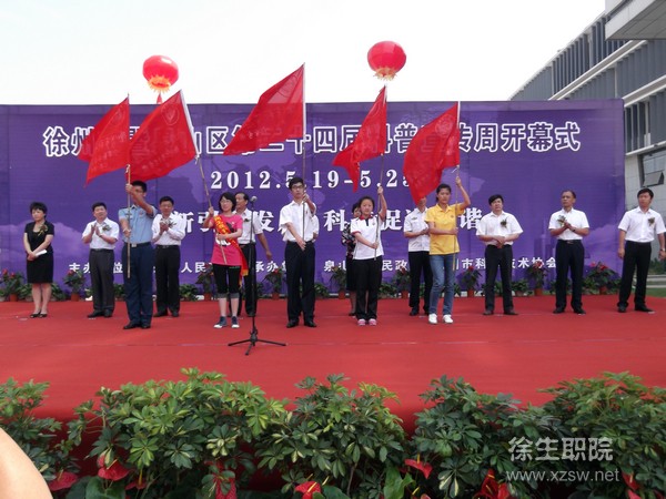 今年我市科普宣传周主题为:创新引领发展、科普促进和谐“,旨在弘扬科学精神,宣传科学知识,加强科普工作,使全社会真正形成讲科学、爱科学、学科学和用科学的良好氛围。开幕式上对徐州生物工程职业技术学院、中国矿业大学、江苏师范大学、徐州空军学院和徐州工程学院5家科普志愿者服务分团进行了授旗,院学生会主席贺琼同学代表我院接旗。