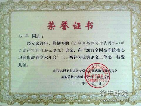 此次会议评选出“2012年度全国高职院校学生心理健康教育先进个人”42名,“2012年度全国高职院校学生心理健康教育优秀论文”86篇。我院孙科老师的论文《五年制高职院开展团体心理咨询的可行性和必要性》获得优秀论文二等奖,大会对获奖先进个人和获奖论文作者予以了表彰。