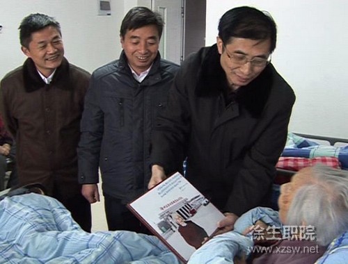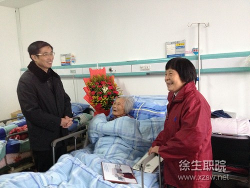 在我院揭牌仪式刚刚结束以后,12月13日上午,学院领导蒋留生、秦越华、刘明生在工会副主席胡忍等同志的陪同下,来到徐州市老年病医院,专程看望和慰问我院建校初期的元老之一,百岁老人钟杏珍老师。