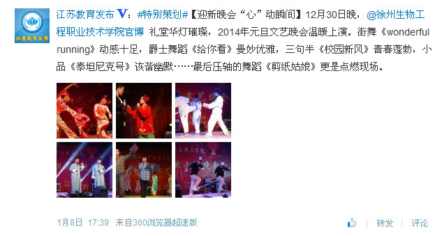 日,“江苏教育发布”政务微博特别策划新年“心”动系列转发我院官博《迎新晚会“心”动瞬间》信息。