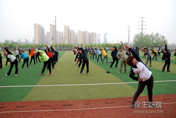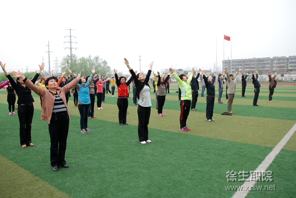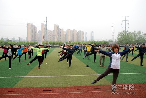 为贯彻落实学院党政提出的“让教职工工作之余身体动起来、体质强起来、心情乐起来”的要求,进一步提高身体素质,自觉养成健身习惯。同时为迎接4月下旬市总工会举办的全市职工广播操比赛,4月11日和14日,我院工会、体育部组织教职工开展第九套广播体操学习普及推广活动,活动受到了老师们的欢迎,近百名教职工利用课余时间在院新体育场学做了第九套广播操。
