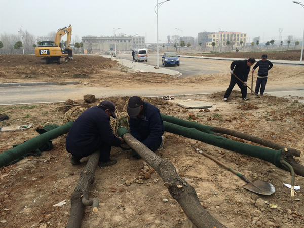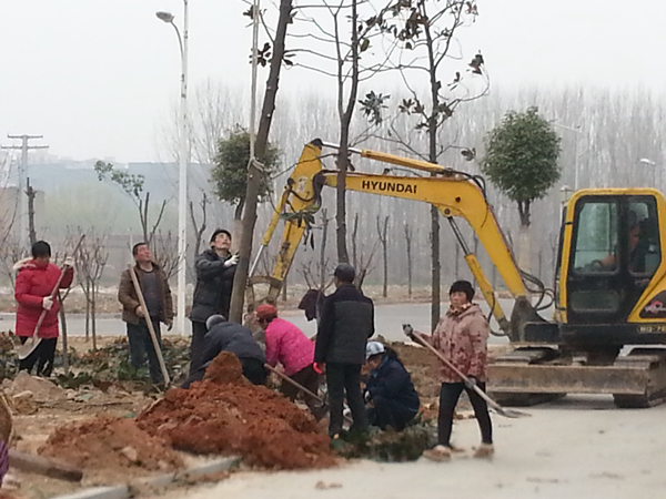 在吊车的轰鸣中,园林绿化工人们细心地将苗木移入指定位置,修枝、挖坑、培土、施肥,随着一株株苗木被栽下,新的希望也在昂然春意中萌发。