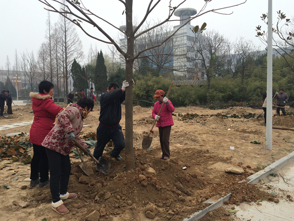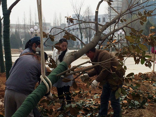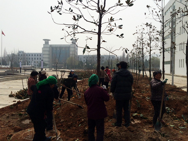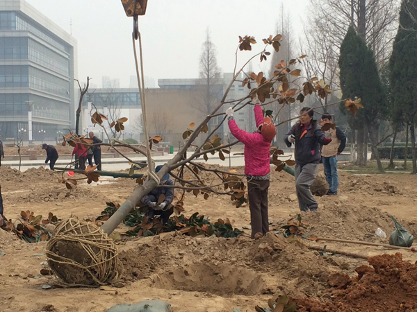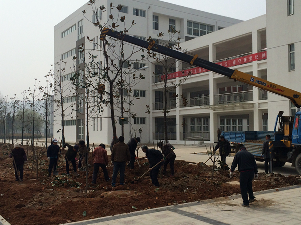 阳春三月,嫩芽初上,3月12日—15日,学院开始对校园进行绿化工程施工。工程将在中心广场栽植朴树、香樟、广玉兰等乔木300余棵,海棠、碧桃、紫荆等灌木200余株以及近300株球形植物和地被,并对校园道路植物进行补植。 在吊车的轰鸣中,园林绿化工人们细心地将苗木移入指定位置,修枝、挖坑、培土、施肥,随着一株株苗木被栽下,新的希望也在昂然春意中萌发。