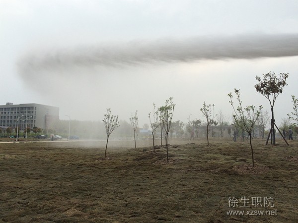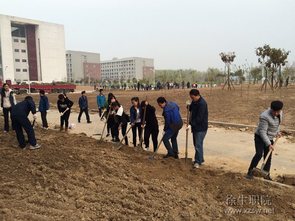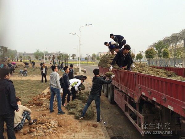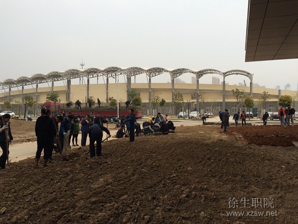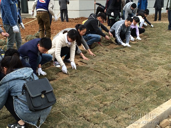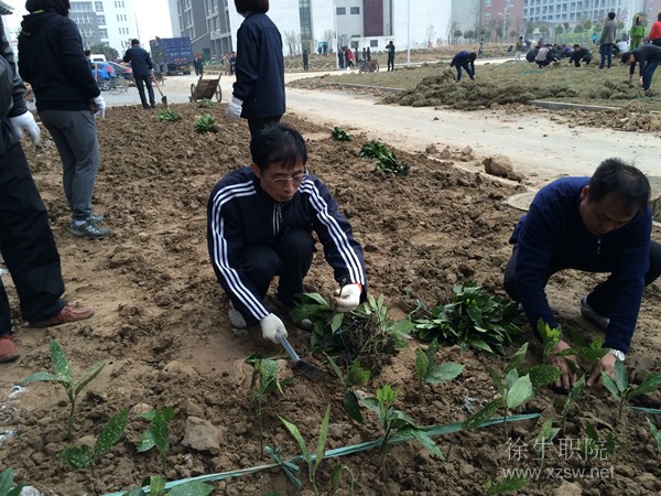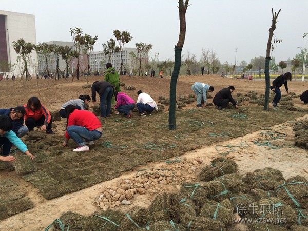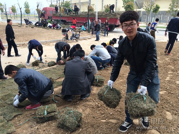 4月12日上午,天空还飘着雨星,校领导、学院各系部处室老师和部分同学来到校园开展绿化活动,松土、挖坑、栽苗、填土、浇水,大家互帮互助、团结协作,到处充满劳动的身影。经过一上午的辛勤劳动,共铺设草坪8000平米,栽植八角金盘3000株、洒金珊瑚5000株,为原本的黄土荒地覆上了一层油油的新绿,更为建设和谐、美丽校园增添了亮丽的一笔。