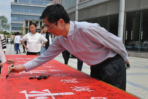 在举国上下庆祝中国抗日战争胜利纪念日暨世界反法西斯战争胜利70周年之际,9月14日上午,我院在学生餐厅前前举办了“纪念中国人民抗日战争暨世界反法西斯战争胜利70周年”师生签名活动和图片展。活动在课间启动,吸引了不少过往师生的热情参与。 图片展示了1931年“九·一八事变”到1945年日本无条件投降的14年中,无数中华儿女为了民族解放,不惜抛头颅、洒热血。整个抗战凝结出了伟大的抗战精神,向世界展示了中国人民天下兴亡、匹夫有责的爱国情怀,视死如归、宁死不屈的民族气节,不畏强暴、血战到底的英雄气概和百折不挠、坚韧不拔的必胜信念。一张张黑白照片串成不能忘却的纪念,使师生们深受教育和鼓舞,观看之余,他们还纷纷在“铭记历史 缅怀先烈 珍爱和平 开创未来”的横幅上认真地写下了自己的名字。 学院举办纪念抗战胜利70周年系列活动,旨在引导广大师生牢记历史,不忘过去,珍惜和平,开创未来,不断增强民族自尊心、自信心和自豪感,增强忧患意识及社会责任感和使命感,为实现中华民族伟大复兴的中国梦而努力奋斗。 院长蒋留生、副院长刘明生等有关领导也参与了此次活动。