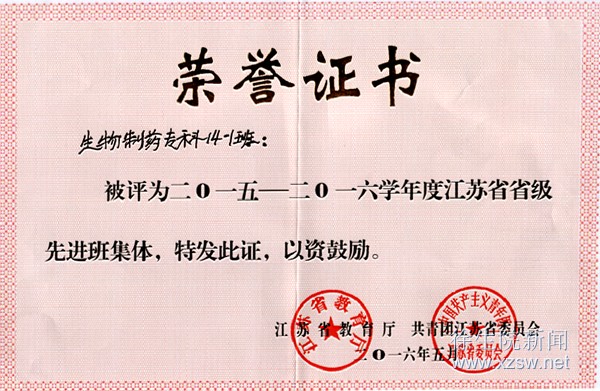 我院生物制药专科14-1班荣获江苏省省级“先进班集体”称号