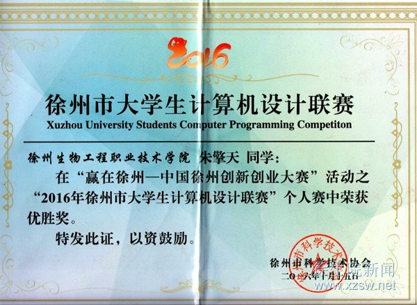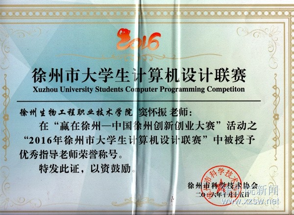 10月15日,由徐州市科协主办,徐州市计算机学会、徐州工程学院承办的2016年徐州市大学生计算机设计联赛落下帷幕,我院财经信息系朱擎天同学获C语言组优胜奖,窦怀振老师获优秀指导教师奖。