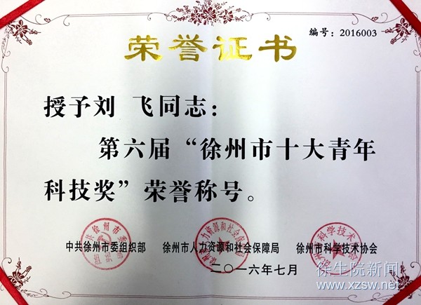 我院农林工程系教师刘飞喜获第六届“徐州市十大青年科技奖”荣誉称号