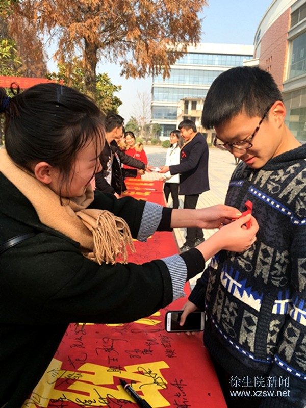在第在第29个“世界艾滋病日”到来之际,由院团委主办、社团联合会承办的“世界艾滋病日”主题宣传活动在学院餐厅前广场举行。 活动过程中,在场工作人员不仅通过展板、宣传单、条幅签名等方式,引导同学们有序参与活动,还推出了“珍爱生命,远离艾滋”的主题微信订阅号,邀请参与同学关注,呼吁大家了解艾滋病的相关知识,号召同学们学会防治艾滋。与此同时,志愿者们把亲手做的红丝带分发给来往的每一位热心的同学,并为他们细心戴上。这牵动爱心的红丝带,不仅拉近了彼此陌生的心灵,同时也让大家用“心”共同参与到艾滋病的预防工作中。 学院领导谢建林书记和蒋留生院长非常重视和关心学院的“防艾”工作,活动当天,在指导做好宣传活动的同时,与同学们一起在条幅签下了自己的名字。 本次活动向同学们进一步普及了艾滋病相关知识,让大家在正确认识艾滋病危害的同时增强了自我保护意识与自我防范意识,对遏制艾滋病的传播具有重要意义。 (供稿:团委)