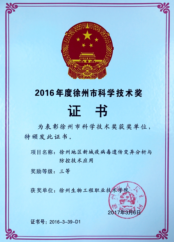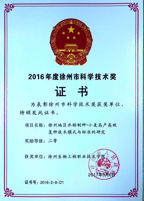 近日,徐州市人民政府下发文件:《市政府关于2016年度徐州市科学技术奖励的决定》(徐政发[2017]6号),公布了我市2016年度科学技术奖获奖名单,我院农林工程系李文红教授主持的《徐州地区水稻制种—小麦高产高效复种技术模式与标准的研究》,动物工程系孙朋副教授主持的《徐州地区新城疫病毒遗传变异分析与防控技术应用》项目分别荣获二等奖与三等奖。 徐州市科学技术奖每年举办一次,评奖的目的在于进一步激发广大科技工作者的创新热情,努力推进科技自主创新、加速优秀科技成果向现实生产力的转化。本年度共评出115个获奖项目,其中一等奖8项、二等奖42项、三等奖59项,企业技术创新奖4项,协同创新奖2项。此次成绩的取得,既是对获奖项目研究人员科研成果的肯定,也是学院长期以来高度重视科研工作的体现。下一步,学院科研管理部门将进一步细化相关政策,努力推动科技成果的应用和转化,以促进我院科研工作再上新的台阶。 (供稿:科研处)