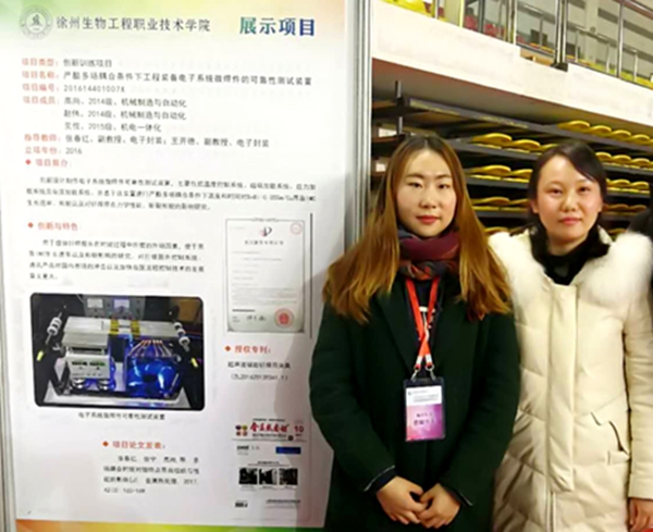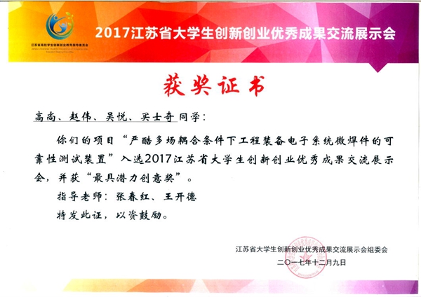 12月9日,2017江苏省大学生创新创业优秀成果交流会在南京工业大学江浦校区举行。来自全省105所本、专科高校的优秀项目参展。我校参赛项目“严酷多场耦合条件下工程装备电子系统微焊件可靠性测试装置”入选并获“最具潜力创意奖”。 该项目自2016年立项以来,在张春红副教授、王开德副教授的指导下,机械制造与自动化专科14班学生高尚等同学多次论证改进设计方案,创新性地设计制作了“工程装备电子系统”,最终完成了“微焊件可靠性测试装置”制作。该测试装置主要包括温度控制系统、磁场加载系统、应力加载系统及电流加载系统,可实现在严酷多场(温度场、磁场、应力场、电场)耦合的情况下进行微型焊接接头的可靠性测试,试验数据更准确。弥补了目前市场上焊接接头可靠性测试的试验设备只能在单一场或两场情况下测试的缺陷。 近年来,我校高度重视学生实践能力与创新精神的培养,稳步推进创新创业教育工作,打造创新创业培育平台,引导学生主动参与创新创业,学生实践创新能力显著提升,学校创新创业项目屡获大奖,取得了一批学生创新创业优秀成果。 (供稿:机电工程系)
