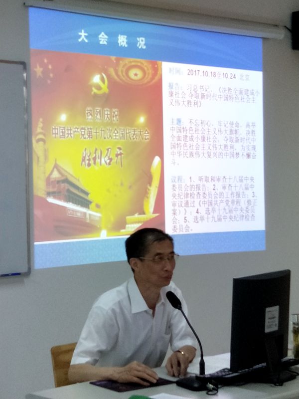 6月1日下午,我院党委副书记、院长蒋留生为第23期党校的全体学员做了题为《开启新时代 踏上新征程——深入学习贯彻党的十九大精神》的专题讲座。 讲座中,蒋留生院长紧扣学习贯彻习近平新时代中国特色社会主义思想和党的十九大精神,从我国发展新的历史方位、开启建设新征程、以人民为中心形成适应新常态、推进“五位一体”总体布局建设中国特色社会主义等方面,结合理论思考与实践总结,对党的十九大提出的重要思想、重要观点、重大论断、伟大目标、具体任务、重要举措等作了系统梳理和深入浅出的解读。他强调,今天的青年是未来实现中国梦的主力军、见证者,责任重大,使命光荣。青年学子要志存高远,信念坚定,脚踏实地,不懈努力,在实现中国梦的生动实践中放飞青春梦想,在为人民利益的不懈奋斗中书写人生华章。 聆听讲座后,广大学员纷纷表示,本次讲座有高度有温度,大家对十九大精神的理解更加深刻、系统,今后将坚定以习近平新时代中国特色社会主义思想为指引,做时代新人,为谱写中国梦贡献青春力量。 (供稿:组织人事处)