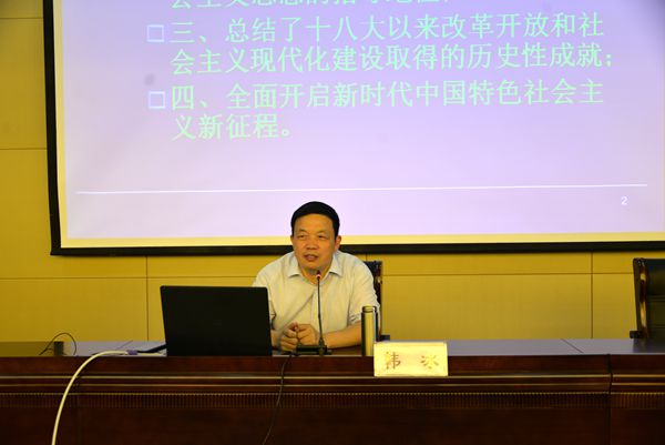 6月29日下午,学院党委中心组在报告厅召开学习(扩大)会议,邀请市委党校副校长韩冰教授为我院党员干部作党的十九大精神专题辅导报告。学院党委中心组成员及全体党员聆听了报告。 报告会上,韩冰教授以《中国特色社会主义进入新时代—学习贯彻党的十九大精神》为题,紧扣习近平新时代中国特色社会主义思想和党的十九大精神,从党的十九大作出了中国特色社会主义进入新时代的重大历史判断、确立了习近平新时代中国特色社会主义思想的指导地位、总结了十八大以来改革开放和社会主义现代化建设取得的历史性成就和全面开启新时代中国特色社会主义新征程四个层面,以更高的政治站位、丰富的理论积淀、通俗易懂的语言和鲜活生动的例子,作了精彩的解读辅导。整场辅导报告主题鲜明、论述透彻,观点新颖、内容丰富,既有理论高度、思想深度,又有很强的实践性、指导性,为全体党员干部深入学习贯彻十九大精神提供了有针对性的指导,使思想受到了启发。 党的十九大召开以来,学院党委中心组把宣传十九大精神作为一项长期工作,使十九大精神成为凝聚人心、鼓舞士气、推动工作的持久动力。从多层次、多角度对十九大报告进行了解读和学习,通过党委中心组和全体党员干部通读十九大报告、专家宣讲、报告解读、专题辅导、开展研讨、知识测试等多种方式,精心、精细、精准学习贯彻十九大精神,真正把十九大精神融入各项具体工作中,在实践中融会贯通,推动学院各项事业不断向前发展。 (供稿:党政办公室)
