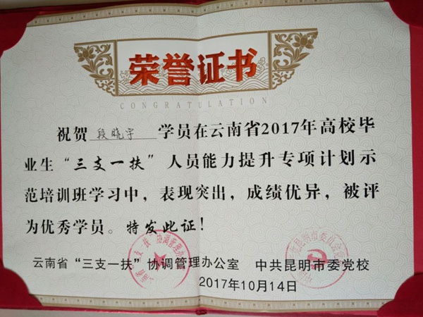 接江苏省高校招生就业指导服务中心通知(苏教指通【2019】41号),我院财经信息系会计与审计专业2017届毕业生段晓宇被评选为“江苏省基层就业大学生先进人物”。该生在校期间,先后获得“三等奖学金”、“三好学生”、连续三年被评为“优秀干部”等荣誉称号。 她积极响应省委、省政府关于面向基层工作就业精神的号召,2017年9月,参加云南省“三支一扶”大学生招录考试,以第一名的成绩被录取,分配到了条件艰苦的云南省红河州河口瑶族自治县老范寨乡卫生院,从事出纳和计生办工作。 在一年多的“三支一扶”工作期间,她勤勤恳恳,任劳任怨,在实践中学真知,始终以服务基层,造福牧民为己任,不断在学习中修善,在参与中成长,在实践中成熟,用自己的汗水诠释更有价值也更有个性的青春。 (供稿:学工处)