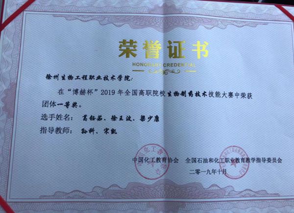 10月25日,“博赫杯”2019年全国高职院校生物制药技术技能大赛在河北石家庄举行。我院生物工程系徐王波、葛鈺茹、梁少康3名同学过五关斩六将,经过激烈角逐最终摘取了团体一等奖的桂冠,孙科、宋凯2位老师荣获“优秀指导教师”。 本次技能大赛由生物发酵岗位实操、青霉素提炼岗位仿真操作两个竞技赛项组成,共有来自江苏、天津、广东、山东等全国各地的18支代表队54名选手参赛。 此次大赛,充分展示了我院学生积极向上的精神风貌以及扎实的专业知识和技能,加深了对生物制药技术专业人才职业能力需求的了解,进一步明确人才培养目标,推动人才培养模式改革;增进与相关院校同类专业之间的交流,达到了以赛促教、以赛促学、赛教结合的目的,为进一步推进专业建设起了积极的作用。 (供稿:生物工程系) |