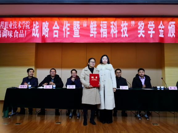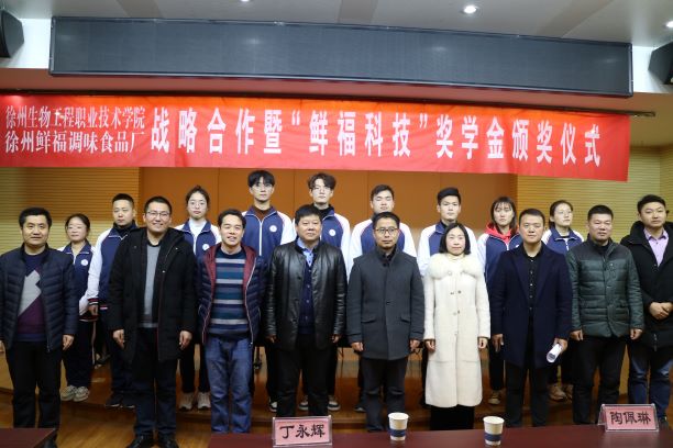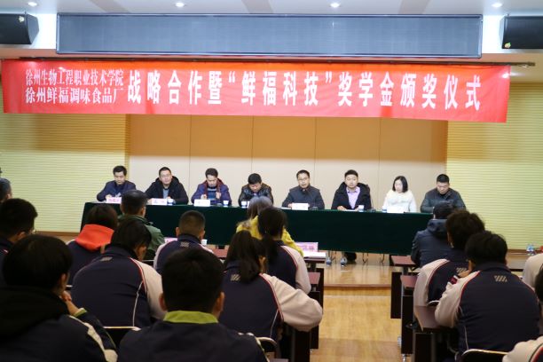 12月18日上午,我院与徐州鲜福调味食品厂战略合作暨“鲜福科技”奖学金颁奖仪式在图文信息中心举行。副院长赵虎及教务处、学工处、生物工程系、农林工程系、动物工程系相关领导,徐州经济技术开发区党工委组织人事部副部长王根群、大庙街道办组织科副科长陈辉、徐州鲜福调味食品厂总经理李莉等领导参加仪式,仪式由生物工程系主任宋凯主持。 赵虎副院长在致辞中表达了对各位来宾的欢迎和感谢以及对获奖同学的祝贺,并向来宾介绍了我院的办学历程、办学特色、办学理念及近年来我院面向社会、紧贴市场、产教研合作、人才合育、事业互促等方面的做法。同时对徐州鲜福调味食品厂设立企业奖学金表示肯定和感谢,要求三个系部利用好现有优秀教师资源,在科技合作、产品研发等方面深化合作,推动我院校企合作向纵深发展,实现互惠双赢,也希望同学们刻苦学习、勇于创新、立志成才。 王根群副部长代表徐州经济技术开发区对本次签约的双方单位、受聘徐州鲜福科技副总的耿凤英博士以及获奖同学表示祝贺,对我院多年来与辖区内恩华药业、万邦生化医药、长江生物、沐阳科技等企业在科技创新、技术研发、项目申报、人才培养与输出等方面建立的深厚院地合作关系表示肯定,并指出生物科技型企业近年来的高速发展对研发技术、高端人才与高素质技能人才的需求越发明显,校企之间有着广阔的合作空间,在人才培养与人才项目申报等校企合作事项上,经济技术开发区组织部、人才办将提供大力支持与帮助。 李莉总经理在发言中表达了对学院的感谢,对同学们的祝贺与期望,并希望校企合作能够稳步推进,实现互惠双赢。 仪式中,双方签订了《校企战略合作协议书》、《徐州生物工程职业技术学院“鲜福科技”奖学金协议书》。李莉总经理为耿凤英博士颁发了徐州鲜福科技副总聘书,与会领导为30名获奖同学颁发了荣誉证书,食药专科18班鲍佳慧代表获奖同学做了发言。 根据校企战略合作协议,校企双方共同成立徐州餐饮文化研究院,徐州鲜福调味食品厂每年为我院生物、农林、动物工程系学生提供3万元“鲜福科技”奖学金,我院在产品研发、人才培养、员工培训等方面为企业提供支持,我院耿凤英博士被聘为企业科技副总,校企双方共同打造淮海经济区食品行业产教深度融合新模式。 (供稿:生物工程系)