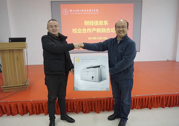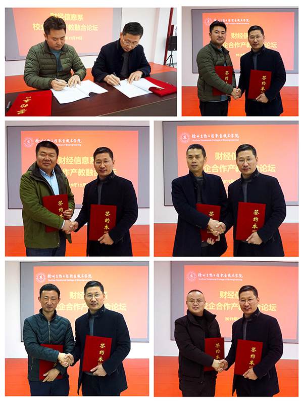 产教融合研讨会结束后,财经信息系袁剑锋主任与多位企业代表签订了校企合作协议书。教务处史先振处长和袁剑锋主任分别为牛自华等12位企业专家颁发特聘教授聘书。汇承数字和玖玖财务咨询公司分别向财信系捐赠教学设备一台。最后,与会人员合影留念,本次论坛取得圆满成功。