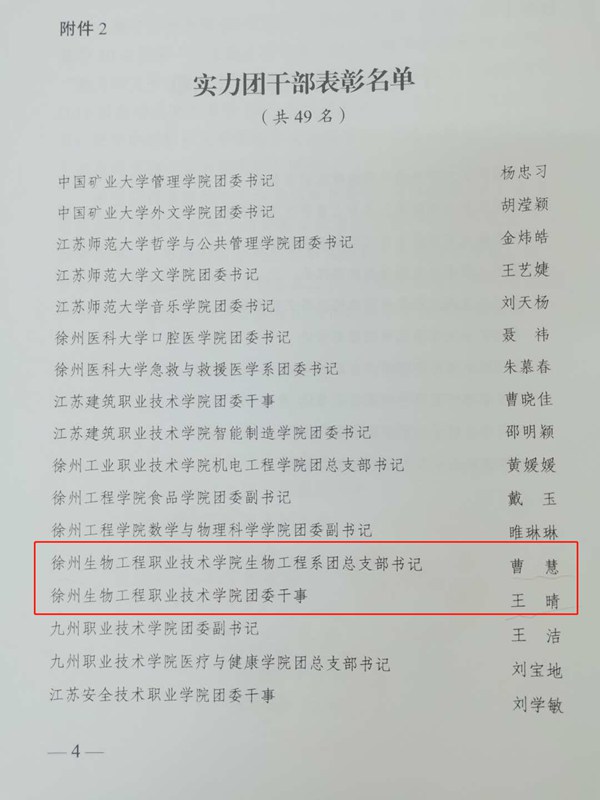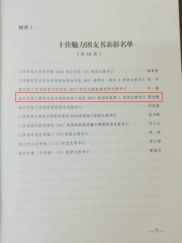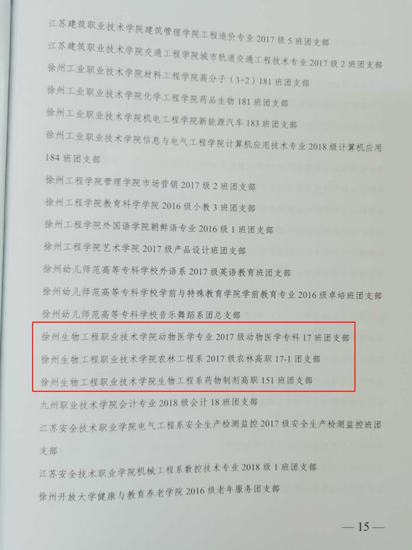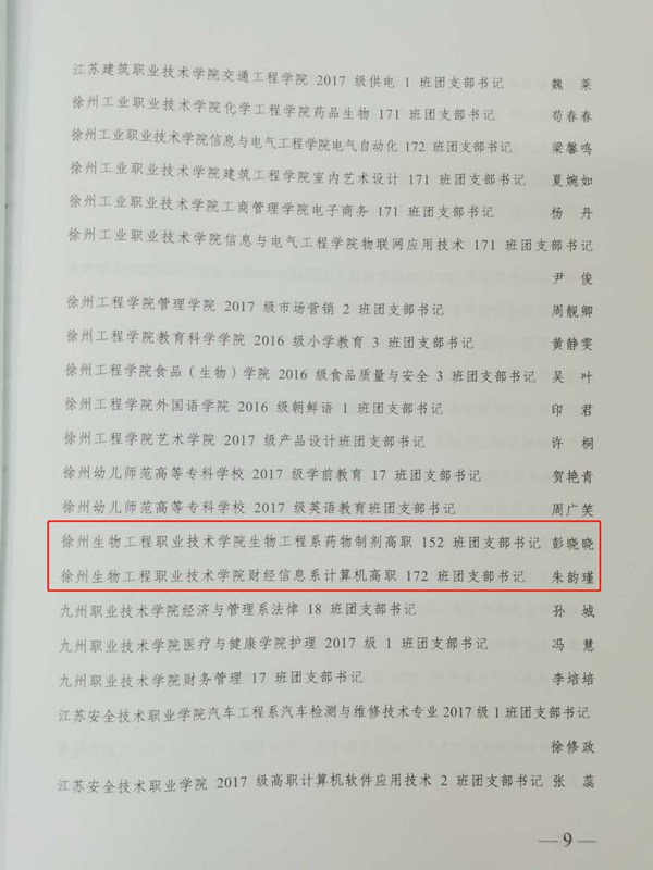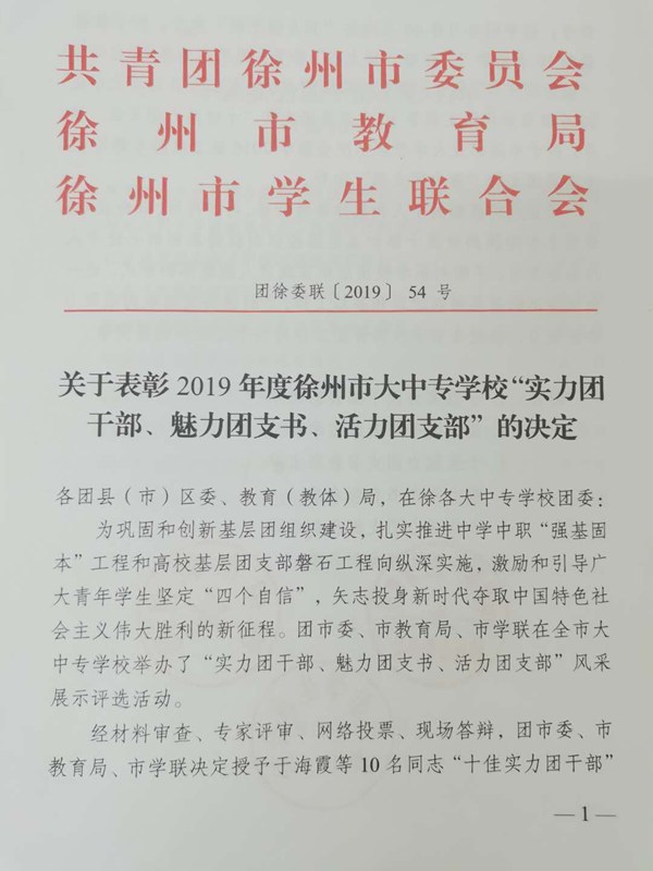 为巩固和创新基层团组织建设,扎实推进高校基层团支部磐石工程向纵深实施,激励和引导广大青年学生坚定“四个自信”,矢志投身新时代夺取中国特色社会主义伟大胜利的新征程。团市委、市教育局、市学联在全市大中专学校举办了“实力团干部、魅力团支书、活力团支部”风采展示评选活动。 根据团徐委联【2019】54号文件《关于表彰2019年度徐州市大中专学校“实力团干部、魅力团支书、活力团支部“的决定》,我院药品食品学院团总支书记曹慧、学院心理教师王晴荣获“实力团干部”荣誉称号;农林工程学院2015级园林高职1班团支书顾欣瑜荣获“十佳魅力团支书”荣誉称号;药品食品学院药物制剂高职152班团支书彭晓晓、信息管理学院计算机高职172班团支书朱韵瑾荣获“魅力团支书”荣誉称号;动物工程学院动物医学专业2017级动物医学专科17班团支部、农林工程学院2017级农林高职17-1团支部、药品食品学院药物制剂高职151班团支部荣获“活力团支部”荣誉称号。 (供稿:院团委) |