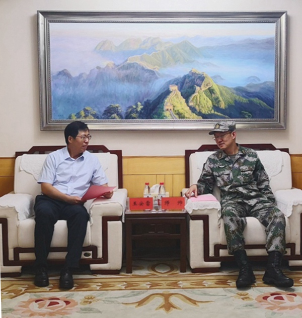 7月30日,在八一建军节来临之际,学院王安雷副院长,学工处郭士焱、杨建洲、仝金鹏、朱以光一行5人来到承训单位73101部队开展节日走访慰问,向部队官兵致以节日的美好祝愿,表达我院全体师生对人民子弟兵的一片深情厚谊。 王安雷同73101部队师帅副政委进行了亲切的交流,了解到部队目前正在执行抗洪和外训任务,王安雷向奋战在一线的官兵表示深深的祝愿。同时,感谢部队长期以来对我院工作的大力支持。 73101部队师帅副政委代表部队官兵对学院领导的到来表示热烈的欢迎和由衷的感谢,并向我院领导介绍了部队的光辉历程。同时,表示在今后的工作中将一如既往地加强同我院做好共建工作,全力保障学院新生军训工作和国防教育工作任务圆满完成。
