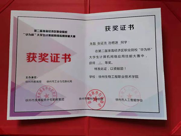 12月27日,第二届淮海经济区职业院校“华为”杯大学生计算机网络应用技能大赛决赛在江苏建筑职业技术学院成功举行,信息管理学院朱磊、张证浩、孙照源代表我校参加决赛,荣获三等奖。 本次大赛分为资格赛和决赛两个环节,资格赛为网络基础理论考试,决赛为组网实操。为了扩大学校和学生的参与面,主办方采取资格赛不限人数,开放考试系统,远程监考,各校在校内组织学生线上考试进行比赛,每校选拔三名学生参加决赛。本次比赛共吸引了来自江苏、山东、安徽等省内外20所职业院校参加。经过资格赛激烈的角逐,朱磊、张证浩、孙照源三位同学脱颖而出,在杜淑颖、蒋瑞芳两位老师的带领下,三位参赛同学经过半个月的集中训练,获得决赛三等奖,特别是2020级同学张证浩,在没接触过网络课的情况下,通过这次培训学习,顺利完成比赛中局域网的组建任务。 本次大赛旨在加强校企融合,提升大学生职业技能,提高学生实践能力和创新能力,为淮海经济区建设和社会发展培养更多技术技能型人才,这和信息管理学院持续推进学校“治人文、精技术”教育教学改革、校企共育专业人才的实践不谋而合。信息管理学院将进一步深化校企合作,促进教学实践深度融合,加强实践教学环节,提高人才培养质量。