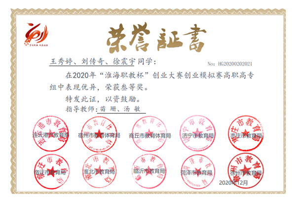 2020年12月29日至30日,由淮海经济区四省十市共同举办的 “淮海职教杯”创业大赛决赛,在徐州工业职业技术学院举行。本次大赛由创业创意高职高专组、创业创意中职组、创业模拟高职高专组、创业模拟中职组四个赛项组成,项目涉及农林、畜牧、食品、电子信息、生物医药等十多领域,共计199个项目、千名师生参赛。在强手如林、竞争激烈的赛场上,我校参赛选手卫生健康学院护理专科201班刘传奇等同学表现优异,荣获创业模拟赛高职高专组三等奖。 此次比赛历时2个月,经学工处精心组织,在全校范围内开展选拔工作,同时选配业务精湛、责任心强的教师悉心指导,经过市赛、区域复赛、决赛层层关卡,最终突出重围。“淮海职教杯”创业大赛是助推淮海经济区职业教育改革发展的重要抓手和有效载体,通过“以赛促教、以赛促学、以赛促创”的方式,打造淮海经济区职业院校沟通交流平台,全面推进创新创业人才培养,促进创新驱动创业、创业带动就业,为城市创新发展提供人才保障。 附:获奖名单 卫生健康学院 护理专科201班 刘传奇 护理专科208班 徐震宇 护理专科209班 王秀婷 指导老师: 苗 珊 汤 敏