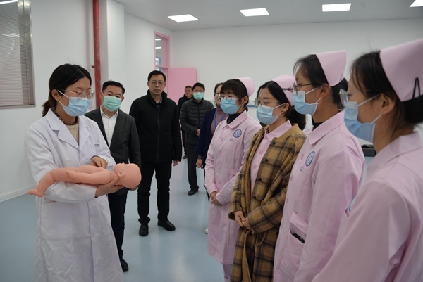 在卫生健康学院,谢建林听取了学院开学工作总体汇报,视察了实训室建设情况,详细了解技能大赛集训进展,并勉励学生刻苦训练,力争在省技能大赛中取得优异成绩,为校争光。