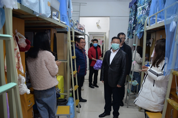 来到北苑学生公寓,谢建林关切询问学生上课网速、教学效果以及师生互动等多方面信息,进一步了解线上教学情况,并关心提醒学生注意疫情防控、用电安全、宿舍卫生等问题。