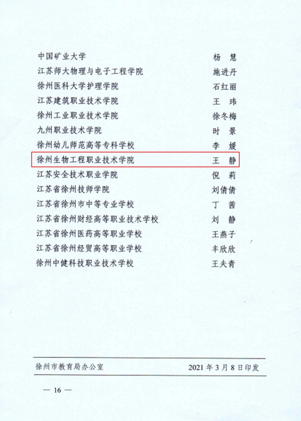 王静现任基础教学部英语教师,在平凡的教学岗位上,兢兢业业,诲人不倦,践行立德树人使命。她授课生动,关心学生,富有爱心和亲和力,被学生视为良师益友。在她的悉心指导下,先后涌现出了2019年省技能大赛英语口语赛项二等奖获得者曾小芮、2020年徐州专转本文科状元翟万祥、2020年“外研社·国才杯”英语写作国赛二等奖获得者刘佳佳等优秀学子。