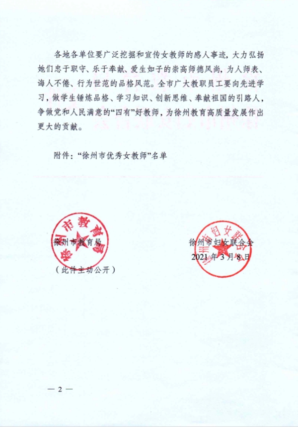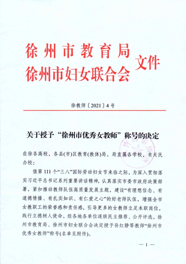 3月8日,我校青年女教师王静被徐州市教育局、徐州市妇女联合会授予“徐州市优秀女教师”光荣称号。