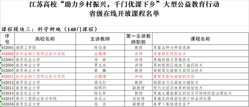 根据江苏省教育厅《关于公布江苏高校“助力乡村振兴,千门优课下乡”大型公益教育行动省级在线开放课程认定结果的通知》(苏教办高函〔2021〕8号),我校农林工程学院白耀博老师申报的《葡萄真菌性病害的识别》、《草莓绿色防控技术》两门课程通过评审,确定为江苏高校“助力乡村振兴,千门优课下乡”大型公益教育行动省级在线开放课程。