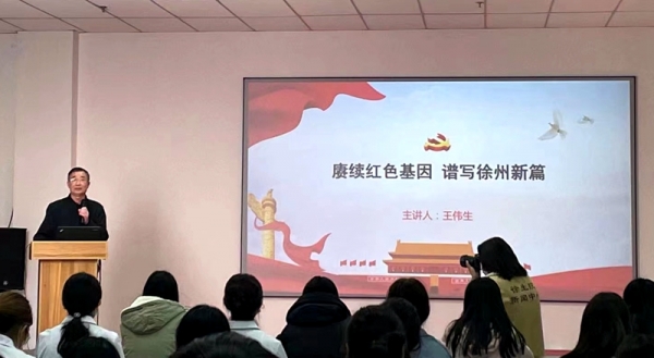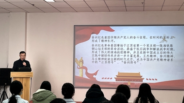 11月4日下午,由基础部、团委、图文信息中心联合举办的红色文化系列讲座在我校泉山校区图书馆学术研究室开讲。首场讲座由由基础部人文教研室主任王伟生主讲,题目是《赓续红色基因 谱写徐州新篇》。王伟生老师长期致力于徐州红色文化研究,主持了多项徐州市社科联红色文化课题,研究成果获奖并入选《徐州智库》《徐州社科专报》。他从徐州红色基因的本质特征、徐州红色基因的形态体现、徐州红色基因的传承之道等几个方面阐释了徐州红色基因是徐州共产党人用忠诚、生命、热血和智慧锻造而成,反映的是在进行中国革命斗争的伟大实践中所形成和表现出来的特有的优秀品质、思想作风和精神风貌。其中,坚定的理想信念是灵魂,为人民服务是初心,爱国主义是主题,忠诚于党是根本要求。引导青年学生不断筑牢信仰之基、补足精神之钙、把稳思想之舵,为建设实力徐州、创新徐州、美丽徐州、善治徐州、幸福徐州而努力学习,不懈奋斗。