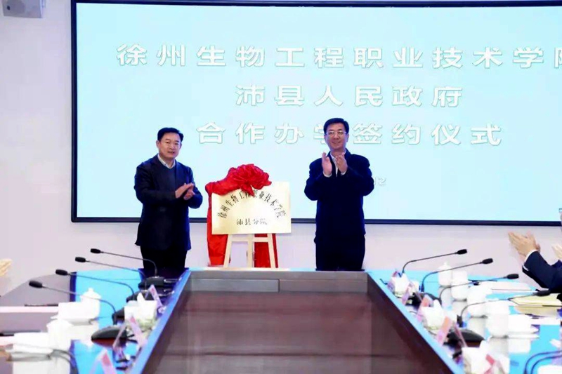 11月12日下午,我校与沛县人民政府合作办学签约仪式在沛县行政中心会议室举行,学校党委书记谢建林与沛县县委书记吴昊共同为徐州生物工程职业技术学院沛县分院揭牌。这是我校继新沂校区、云龙校区揭牌后办学区域的又一次拓展,标志着我校正式形成一体三翼、四位一体的办学格局。
