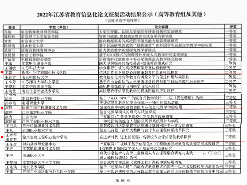 新沂分院王蓉老师论文《信息化背景下高校心理健康教育的创新模式探究》荣获二等奖,动物工程学院高峰老师论文《微课在高职院校畜牧兽医专业信息化教学中的应用》、王海军和张善芳老师论文《奋进新时代 迈上新征程,高职校专业课信息化教学探析》荣获三等奖。