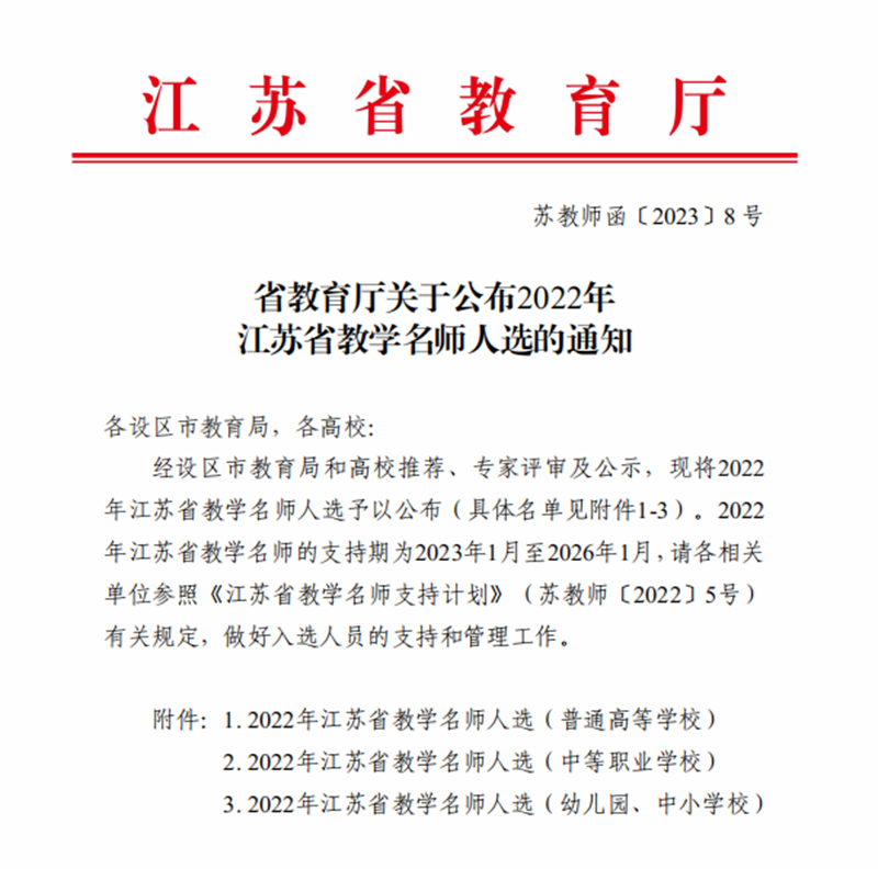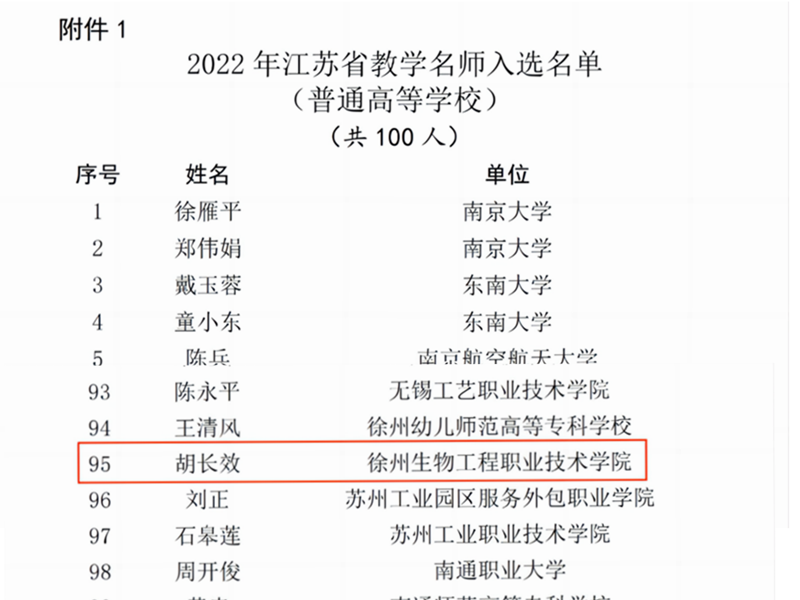 近日,江苏省教育厅发布了《关于公布2022年江苏省教学名师人选的通知》,我校胡长效教授荣获“江苏省教学名师”称号。