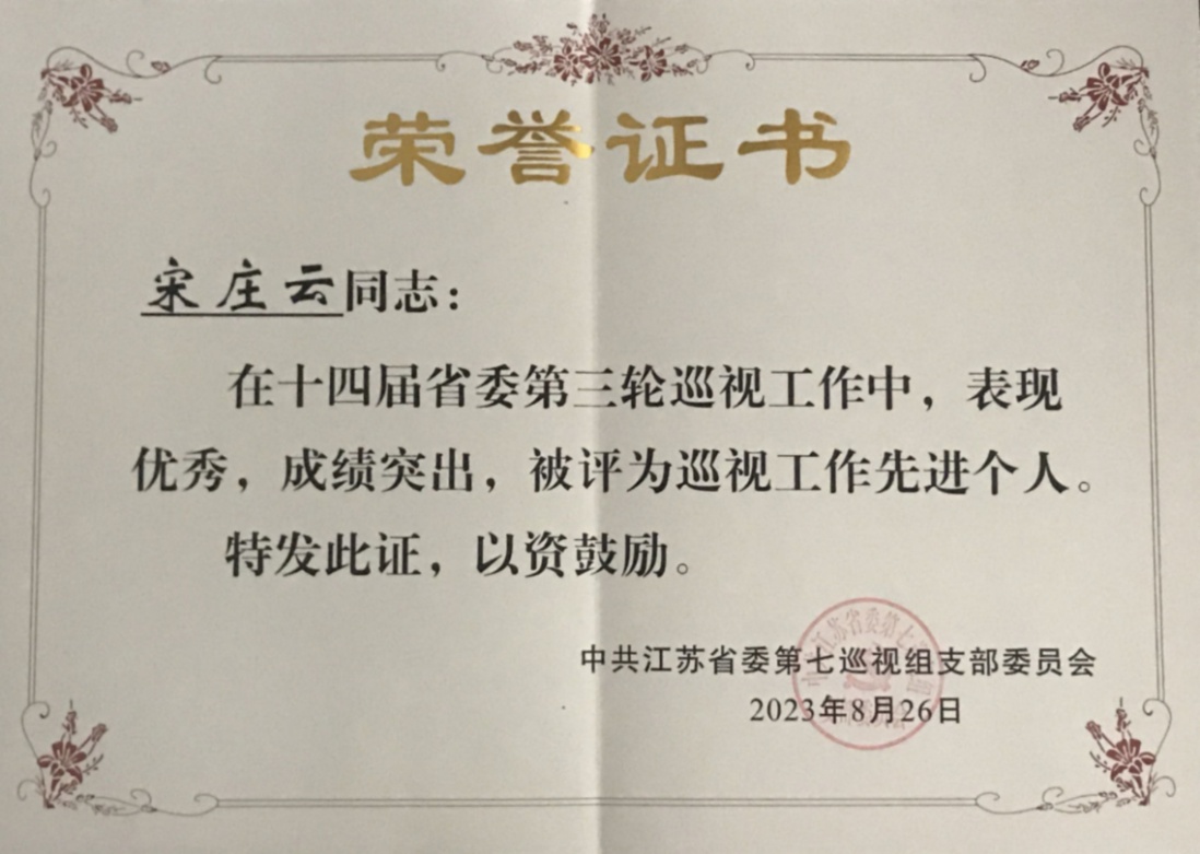 2023年4月至8月,宋庄云同志按照组织安排,被抽调参加十四届省委第三轮巡视。巡视期间,宋庄云同志注重学习研究,锐意进取、主动作为、攻坚克难,成绩突出。鉴于宋庄云同志在抽调期间的优秀表现,中共江苏省委巡视组决定予以通报表扬。