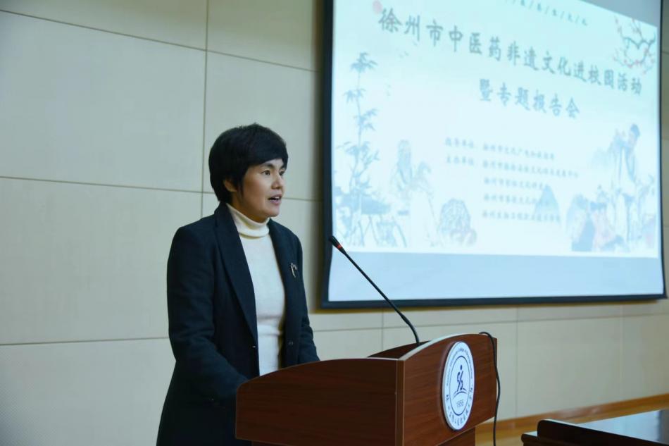 我校党委副书记谭红玲代表学校致辞,向活动举办表示祝贺,向为中医药文化传承与创新做出贡献的社会各界友人表达崇高敬意。她强调,中医药文化是中国优秀传统文化的重要组成部分,传承好、发展好中医药文化,让有着几千年历史传承的中华瑰宝焕发出新的时代生机,是我们作为立足“大生物 大健康”办学定位高校应有的使命与担当。生物医药类专业作为我校重点建设的品牌优势专业,一定会借此良机,继续发挥“党建引领 文化浸润 本草芬芳 国药传承”培育中医药文化传承人的“三全育人”案例示范作用,坚守中华文化立场,传承中华文化基因,为发展生物医药大健康产业,建设淮海经济区中心城市提供更强人才支撑。徐州市文化广电和旅游局党委委员、副局长牛刚和徐州市彭祖文化研究会会长韩松在致辞中均表示中医药非遗文化是我国非物质文化遗产保护的重要组成部分,希望通过此次活动让更多人了解这一文化,助力中医药文化在传承中发扬光大。