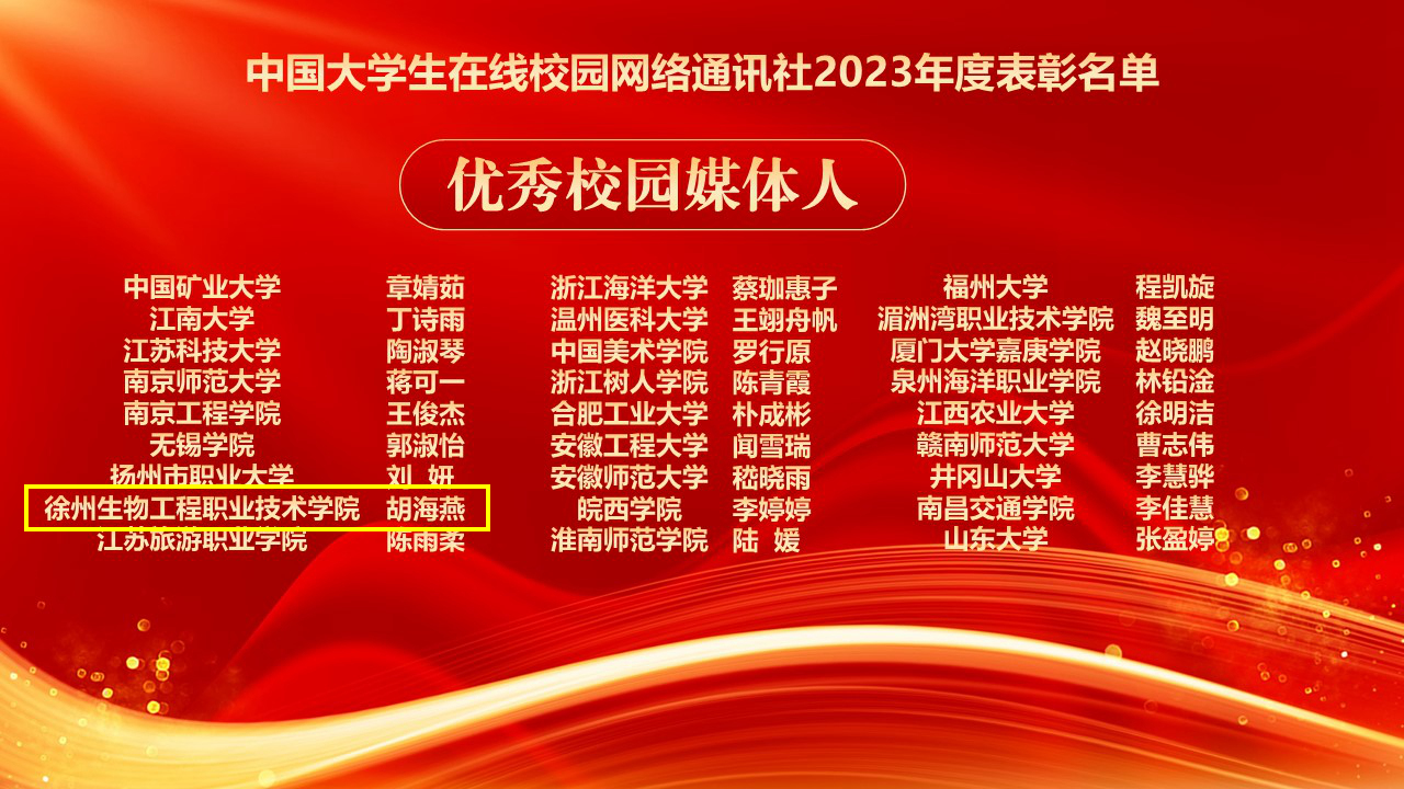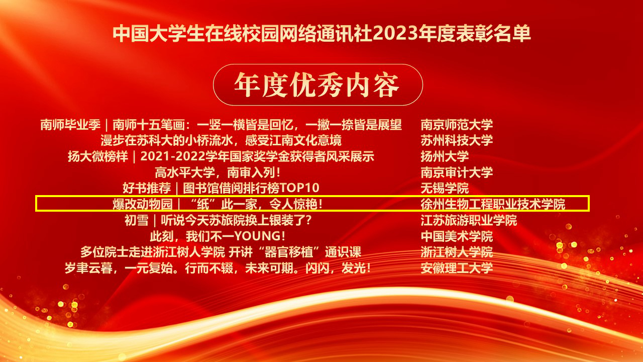 12月14日,教育部中国大学生在线公布了校园网络通讯社2023年度表彰名单,我校党委宣传部校园网络通讯站从全国689所设立了大学生校园网络通讯站的高校脱颖而出,荣获全国“2023年优秀校园网络通讯站”,党委宣传部芦超男老师获得“校园网络通讯站优秀指导教师”,校园网络通讯站胡海燕同学荣获“优秀校园媒体人”,由动物工程学院原创供稿的新媒体作品《爆改动物园|“纸”此一家,令人惊艳!》获得“年度优秀内容”。自2022年我校在上述四类表彰中获奖后再次蝉联。党委宣传部在2023年教育部中国大学生在线校园行活动评比中,成绩突出,被评为全国“校园行优秀组织单位”。