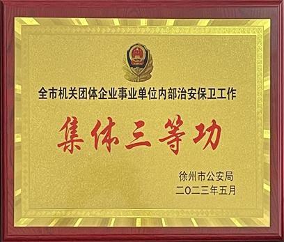 徐州市公安局 《关于表彰2022年度全市机关团体企业事业单位内部治安保卫工作先进集体和个人的决定》 (徐公局[2023]115号)文件,给予我校安全保卫处记集体三等功一次。