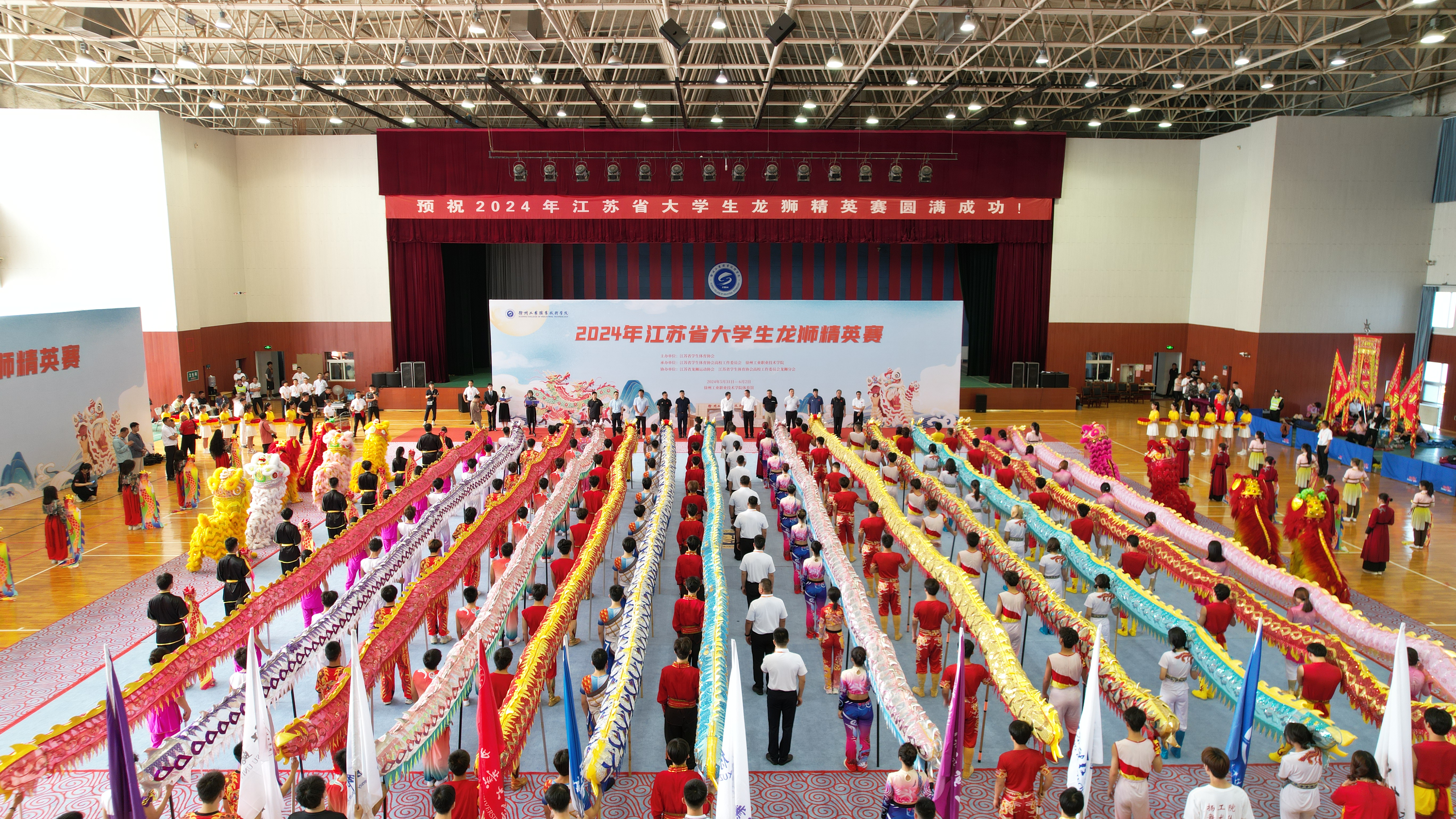 5月31日至6月2日,我校龙狮队代表学校参加2024年江苏省大学生龙狮精英赛,本次比赛由江苏省学生体育协会主办,江苏省学生体协高校工作委员会和徐州工业职业技术学院承办,全省各类高校共15支代表队,493名学生参赛,包括男子舞龙自选、男子舞龙规定、男子竞速舞龙、女子舞龙自选、女子竞速舞龙,北狮自选、竞速北狮,南狮传统,健身龙舞推广套路、健身龙舞自选套路等项目。