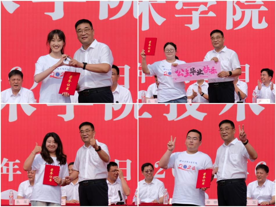 校党委书记徐锋为获得省级表彰的毕业生一一颁奖并合影留念。党委副书记、校长张军为毕业生代表颁发毕业证书。党委副书记谭红玲宣读省级表彰文件,党委委员、副校长赵虎宣读准予毕业文件,党委委员、副校长王安雷宣读校优秀毕业生表彰文件,党委委员、纪委书记刘颖宣读校友联络员聘任文件,主席台领导为校级优秀毕业生代表颁发荣誉证书,为2024届校友联络员代表颁发聘书。