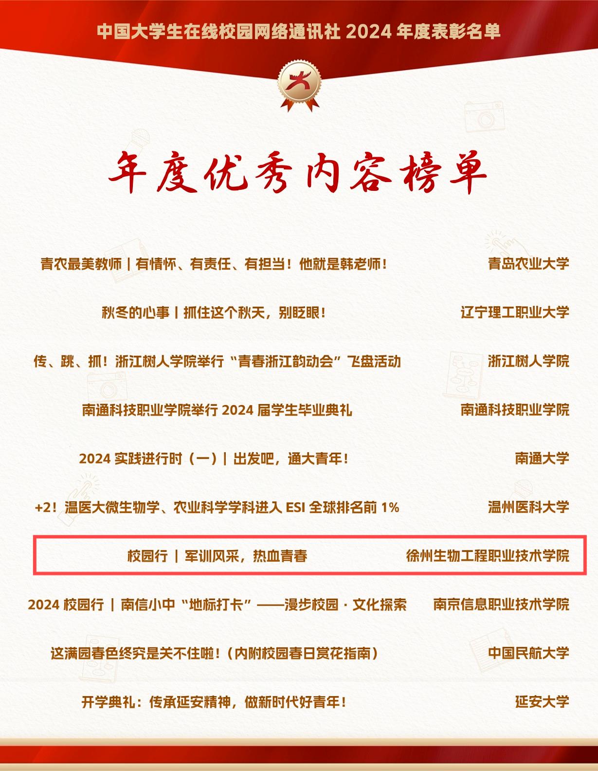 近日,教育部中国大学生在线公布了全国校园网络通讯站及校园行活动2024年度表彰名单。我校荣获“全国优秀校园网络通讯站”,党委宣传部王晴老师获得“优秀指导教师”,校园网络通讯站杨丛瑄同学荣获“优秀学生编辑”,通讯站文章《校园行|军训风采,热血青春》入选“年度优秀内容榜单”。这是我校连续第3年受教育部中国大学生在线表彰,也是我校持续加强网络思想政治教育,推进“三全育人”工作中取得的又一重要成果。