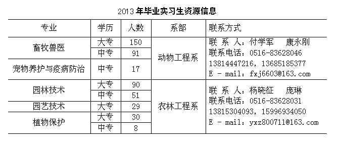 兹定于2013年4月21日(周日)上午在徐州生物工程职业技术学院举办“2013年农业类专业毕业实习专场招聘会”,我们热忱邀请贵单位莅临,选拔录用毕业实习生。
