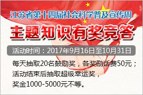 为深入学习贯彻习近平总书记在哲学社会科学工作座谈会上重要讲话精神,省社科联决定在今年全省第十四届社会科学普及宣传周期间,重点围绕宣传《江苏省社会科学普及促进条例》和《关于培育和践行社会主义核心价值观的意见》《关于实施中华优秀传统文化传承发展工程的意见》以及“聚力创新、聚焦富民,高水平全面建成小康社会”目标任务等内容,举办主题知识有奖竞答活动,为促进全社会关心、支持社科普及,推进“两聚一高”新实践、建设“强富美高”新江苏,迎接党的十九大胜利召开营造良好社会氛围,我院决定参加此次活动,现将活动相关事项通知如下,请大家积极参与: