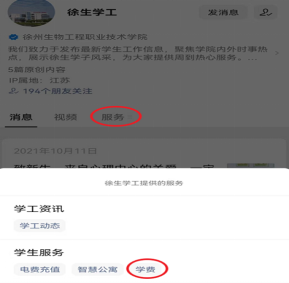 (2)进入功能页面,在“学生服务”菜单栏选择“学费”(如图二)。