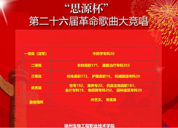 12月9日晚,由校团委主办、二级学院承办的纪念“12·9”运动85周年暨“思源杯”第26届革命歌曲大竞唱比赛决赛在我校大礼堂隆重举行。学校党委委员、副校长王安雷,各二级学院党总支副书记,各二级学院团总支书记及现场500多名同学观看了比赛。本次活动特邀徐州幼儿师范高等专科学校艺术中心主任吴雪梅、江苏省音乐家协会会员徐丽娅和五位校内教师担任评委。 岁暮天寒,但同学们热情似火。勿忘历史,歌声嘹亮,徐生学子的爱国热情,在优美旋律中荡漾。在各二级学院预选中胜出的12个参赛班级,经过两个小时的激烈角逐,最终,中药学专科20班,荣获本次比赛的一等奖。 纪念“12·9”运动85周年暨“思源杯”第26届革命歌曲大竞唱比赛,作为我校一项“治人文”系列精品校园文化活动,既是徐生青年每年一度的艺术展演,又是理想信念教育的生动实践,已经成为我校加强大学生思想文化引领的重要载体。徐生学子将以红歌颂中华,传承一二·九精神,继续奋斗富国强国梦!