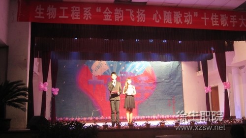 为繁荣校园文化生活,努力营造积极向上、健康文明的校园文化氛围,并为学生提供展示自己才华的舞台,由生物工程系主办的“金韵飞扬心随歌动”十佳歌手总决赛于11月8日晚在院大礼堂隆重举行。