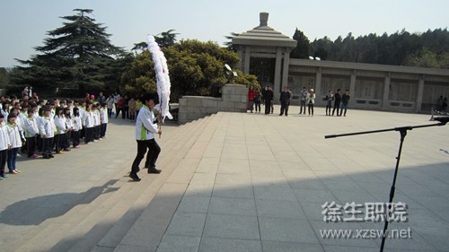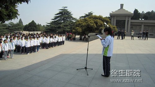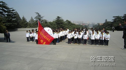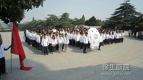 在庄严的国歌声中,悼念仪式正式开始,全体成员向烈士纪念碑肃立默哀三分钟,以表达对革命先烈的崇高敬意和哀悼之情。接着学生代表向烈士们敬献花圈,并宣读了悼词,最后大家踏着沉重的步伐绕塔一周进行参观。仪式结束后同学们相继参观了总前委群雕、淮海战役烈士纪念馆等景点。
